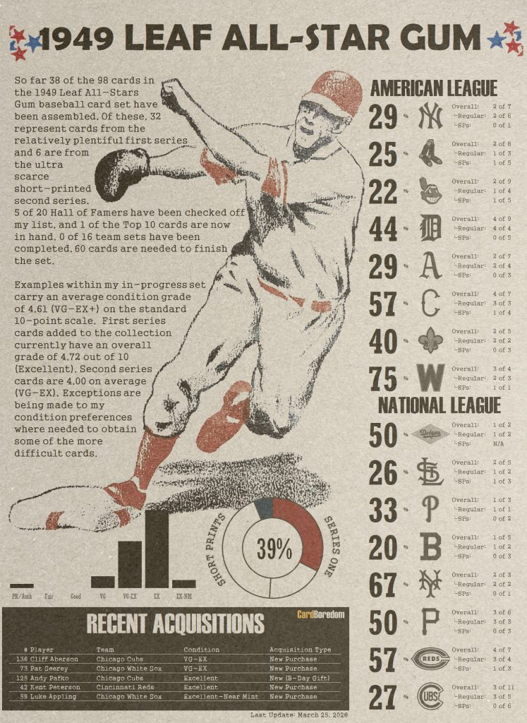 Is there anything truly like the “Nickname Set?” Seemingly every ballplayer featured on a 1949 Leaf baseball card carries an instantly memorable name like “Fire Trucks,” “Dizzy,” “Prince Hal,” “Stubby,” and “The Bear,” and those are just the pitching rotation of the Detroit Tigers in the set. Leaf produced a total of 98 cards brightly colored, block lettered cards for the 1949 season in the one of the truly landmark issues in card history. Boasting not only one of the greatest checklists in collecting history, the full extent of this sets secrets remained a mystery for decades after its release. Half the checklist is so rare that a full accounting of just who was in it remained a mystery for two decades after the cards first hit candy aisle shelves. How can I NOT help but collect these cards?