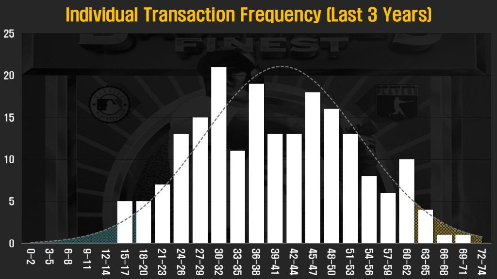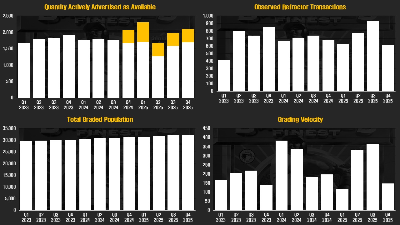 Below are several metrics showing the progression of the market for 1993 Finest Refractors. These graphs illustrate the developments of the past three years in quarterly increments. More than a dozen sources are regularly used to compile data describing the set and collector interest. Data is up to date through December 31, 2025.