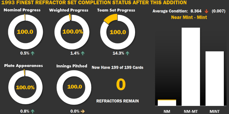 This post represents the 199th and final profile of a card appearing in the ’93 Finest checklist. This seems like just the start of the information I would like to share about these cards and its completion frees up resources for deeper looks at other aspects of collecting these cards. Some collectors have reached out with ideas of things they would like to see, and I am all ears to any suggestions. In early January I intend to push out an expanded version of my (now) annual Refractor Report. Following shortly behind that are looks into the world of unopened Finest materials and the alleged short-prints of the set, complete with a theory that actually matches up with the data rather than relying on anecdotes. Even more is on the way.