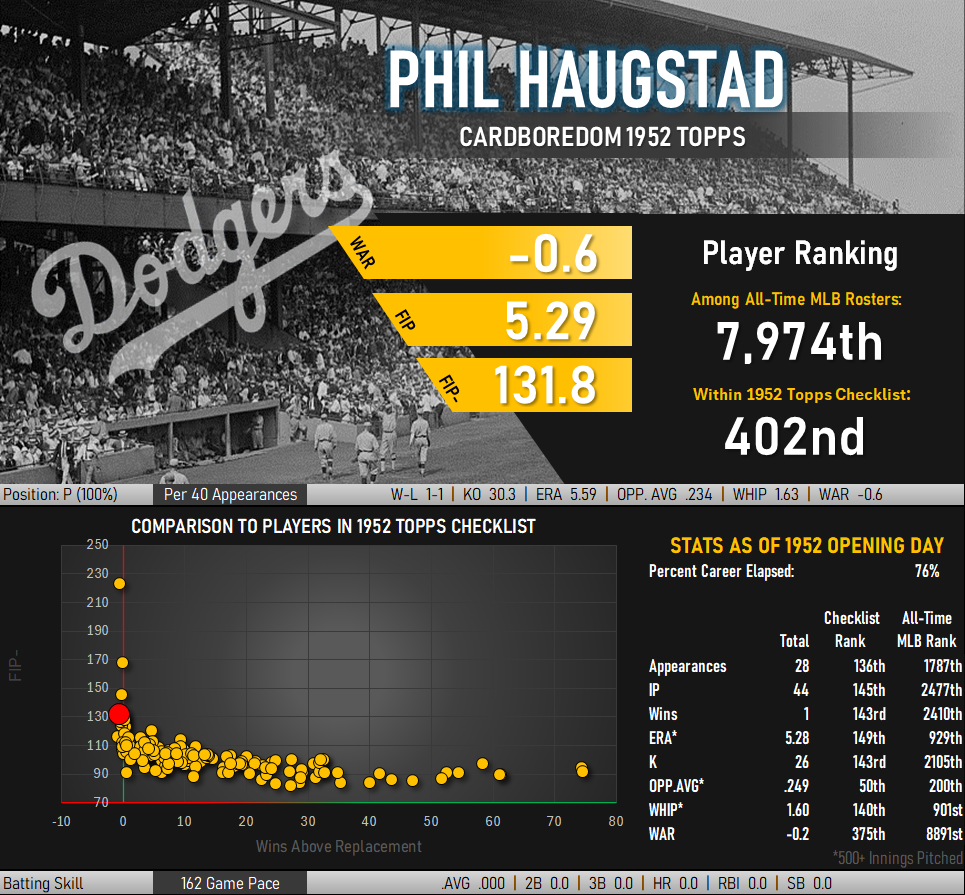 The reason for this hesitation to put Haugstad into the games of a contending team bore some similarities to the fictitious Cubs reliever. He hit 1 out of every 65 batters he faced – about 3x as often as headhunters like Sal “The Barber” Maglie. Walks came almost every inning. He also gave up home runs with some regularity, surrendering longballs almost 50% more often than the average hurler of 1951. Phrases such as “violent” and “wicked” often accompanied descriptions of his pitching motion, giving some sense of the intensity with which these seemingly randomly placed pitches would arrive in the general neighborhood of the plate.