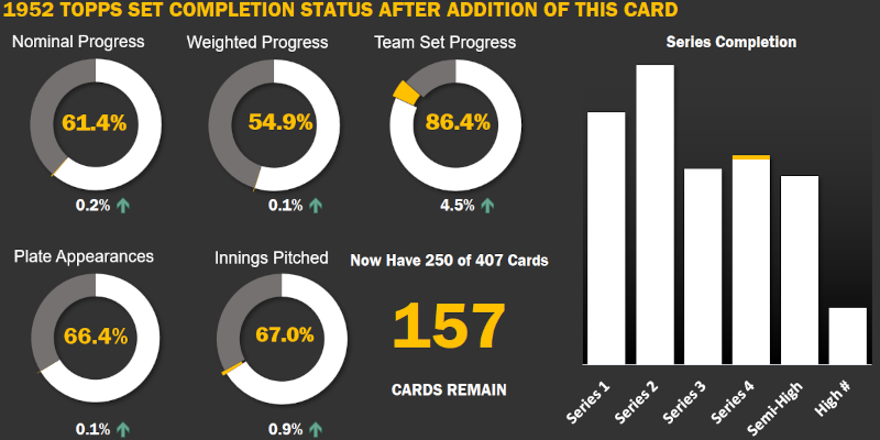This is my 250th unique card from the 1952 Topps set and takes me tantalizingly close to 90% completion of the Philadelphia A’s team set (3 cards to go). The overall condition is pretty nice, brought down by an out of the way crease in the lower right corner. Kellner looking towards the upper left draws your eye away from it, helping this card more than others with similar wear.