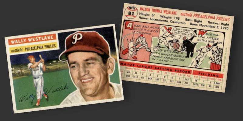 Westlake bookended his cardboard career with another oddity. He appears in the 1956 Topps set as an outfielder for the Philadelphia Phillies. Now with the sixth team in five years, Westlake had been signed in the 1955-56 offseason to provide some pop at the plate alongside a serviceable outfield glove. Indeed, the comic strip on the back begins by calling out him as a long ball hitter and ends by highlighting his good arm. Too bad he played all of five plate appearances across five games before being released one month into the season.